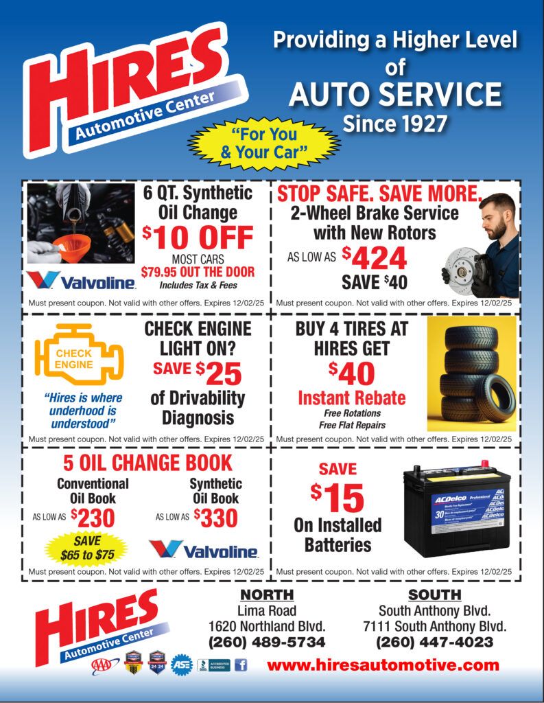 Hires Automotive Center offers service specials and everyday service pack bundles that can save you money. Our mechanics take great pride in offering affordable service at both of our locations. For more information, please call (260) 489-5734, (260) 489-4480, (260) 484-0226 or message us online.